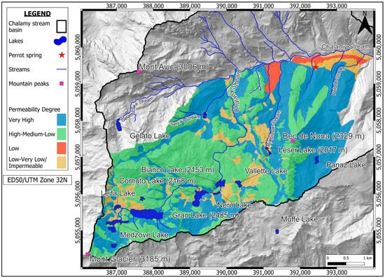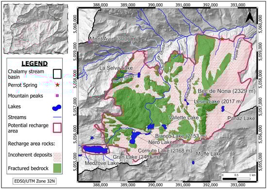 The underground flow, which follows the direction of the maximum hydraulic gradient, has a large main flow from SW to NE. Specifically, there is a local contribution from the slopes of Bec de Nona towards the spring (south to north), following a preferential path through the incoherent deposits present. There is also a local contribution from the Chalamy Stream that also drains the lake area towards the spring, following a path determined by the local topography. It is thought that this latter subterranean outflow may be accommodated in the incoherent deposits present on the surface and in the discontinuities of the rocky bedrock, the latter constituting a deeper water circuit. In addition, in relation to the geological setting, it is not possible to exclude a minority contribution to recharge from the southern sector outside the study area, corresponding to the northern slope of the Champorcher Valley (Figure 11).