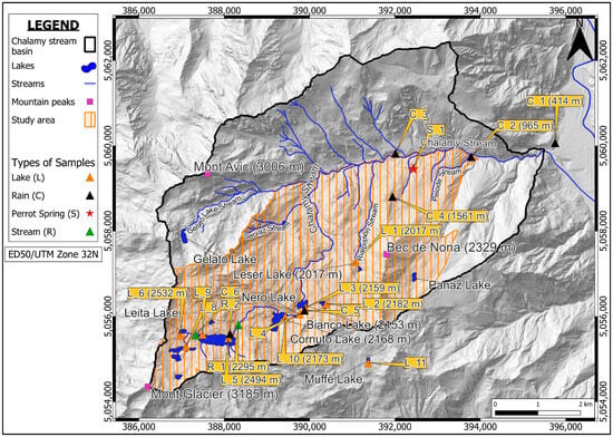 Six sampling campaigns were conducted in May, July, and November 2021, and in February, July, and September 2022. The 19 sampling points included water from the Perrot Spring (n = 1), rainfall (n = 6), lakes (n = 10), and streams (n = 2) within the Chalamy Basin (Figure 4) (Table 2). In the field, temperature, electrolytic conductivity (EC), and pH were measured with a Hanna HI98130 m and then repeated in the laboratory (resolution, precision of temperature samples 0.1 °C, 0.5 °C; EC: 0.01 mS/cm, 2% full scale; pH: 0.01, 0.05). At each sampling point, two samples were collected in polyethylene bottles (250–500 mL) for chemical and isotopic analysis. The location of the rainwater collectors was chosen to conduct an isotopic study and, more specifically, to determine the isotope gradient (Figure 4). The rain samplers were HDPE containers connected to a funnel which acted as a rainfall conveyor inside the container. A layer of paraffin oil (0.5 cm) was inserted in the container to prevent or significantly reduce the loss of water by evaporation. A fine-mesh net was attached to the top of the funnel and used as a filter for any material that may obstruct the rainwater inlet during the sampling period.