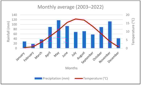 Cumulative rainfall at the Chevrѐre Station for the period 2003–2022 (Figure 5) shows an annual average value of 863.61 mm/year, with a minimum value of 419 mm/year in 2022, and a maximum value of 1327 mm/year in 2018. The graphic evidence two predominantly rainy months on average, May, and November, with values of 115 mm and 112 mm, respectively (Figure 6).