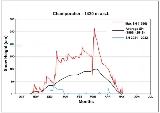 The thickness of the snow cover in the study area varies as a function of altitude, with the greatest thicknesses at the highest altitudes, ranging from 50–120 cm in 2021–2022 []. At the snow station closest to the study area (Champorcher station), the presence of snow on the ground was registered between November and May, with the maximum height in March []. The maximum average snow height in the period 1996–2019 reached 100 cm; the maximum snow height (250 cm) was measured in March 1996. In 2021–2022 the snow height remained below 50 cm. Considering that the study area is at a higher altitude than the Champorcher Station, it is likely that the snow height would have reached higher values in the period 2021–2022. The decrease in the snow cover between March and May indicates the prevalence of snow melt during this period (Figure 7).
