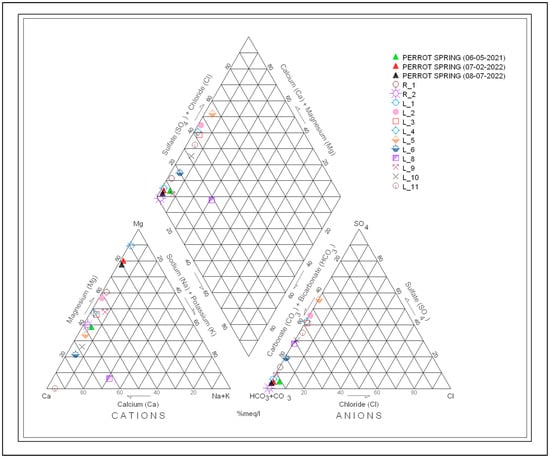The EC varies from 9 µS/cm to 176 µS/cm. The lowest EC value was found north of Gran Lake (L_9) and the maximum at Muffè Lake (L_11). The waters of the Perrot Spring (S_1) have an average value of 85 µS/cm. The values of EC increase with decreasing altitude; thus, EC generally increases moving from Leita Lake, Gran Lake, Cornuto Lake, Nero Lake, Bianco Lake, Vallette Lake, Leser Lake, to the Perrot Spring. The pH varies between 7.64 (R_1) and 9.40 (S_1), indicating a slightly alkaline character. The highest values are concentrated in the Chalamy Stream and in the Perrot Spring, with the pH decreasing with altitude. The Perrot Spring has an average value of 8.83. The water temperature is quite constant during the year, ranging from 4.8 to 6.5 °C (respectively, May and July). The average spring discharge ranges between 8 L/s (in October and April) and 45 L/s (in June and December). The increase in the discharge is connected to the spring thaw and autumn rainfall infiltration. The water of the Perrot Spring has the lowest temperatures and can be classified as cold according to the Mouren classification []. The warmest waters were measured in the lakes. The concentration of the main ions in the lakes and streams is usually very low. Almost all the sampled waters (the Perrot Spring and surface waters) belong to the calcium–magnesium bicarbonate facies (Figure 8). This hydrochemical facies is typical of surface cold and relatively recent groundwater. Samples L_2, L_5 and L_7 have a calcium–chloride-type nature.