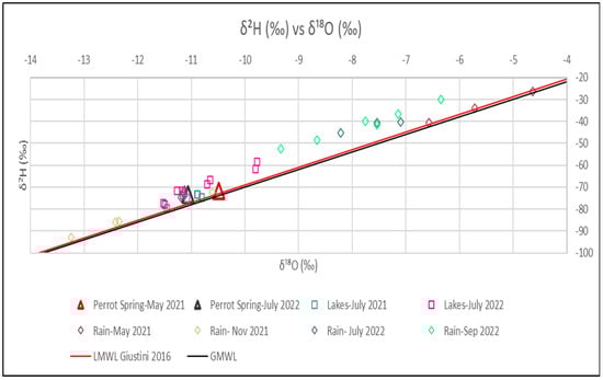 The plot of δ²H vs. δ¹⁸O considers precipitation (Figure 9), surface water, and groundwater (Figure 9). Rainfall isotope values are highly variable (with δ²H from −92.76‰ to −26.37‰; and δ¹⁸O from −13.24‰ to −4.64‰). Groundwater samples from the Perrot Spring have very similar values (with δ²H from −73.38‰ to −71.83‰; and δ¹⁸O from −11.06‰ to −10.49‰). Surface water has a slightly wider distribution of isotopic values than groundwater (with δ²H from −96.01‰ to −58.54‰; and δ¹⁸O from −13.41‰ to −9.78‰).