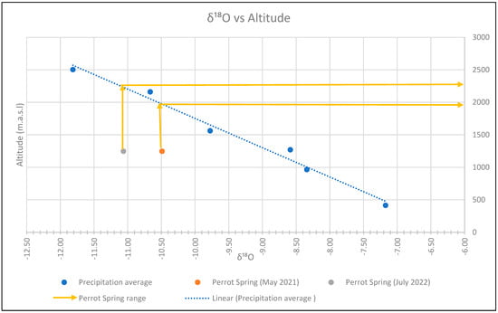 δ18O data of rainfall (sampling campaign of May and November 2021 and July and September 2022) were averaged and then plotted against the altitude of sampling (Figure 10). Finally, they were compared with the δ18O of the Perrot Spring (May 2021 and July 2022), in order to evaluate an average recharge altitude for the spring (Figure 10).