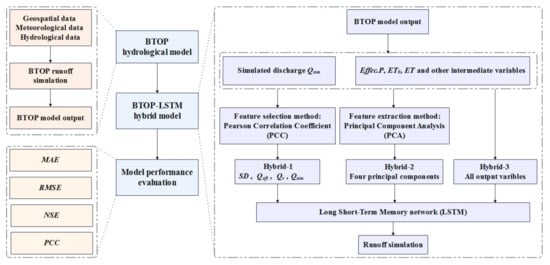- Hybrid-3: All output variables from the BTOP model were directly fed into the standalone LSTM as additional features without any dimensionality reduction.