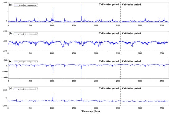 - The feature selection method, PCC, and the feature extraction method, PCA, can effectively eliminate noise within the hydrological sequences. Feeding all the BTOP model estimates into LSTM (Hybrid-3) does not enhance simulation performance but instead leads to poor simulation accuracy due to redundant and irrelevant information. Notably, Hybrid-3 exhibited overestimation behavior in the mid-flow, resulting in model accuracy far lower than Hybrid-1 and Hybrid-2 and even lower than the standalone LSTM. It is confirmed that implementing the feature dimension reduction method before constructing the hybrid model is an effective strategy to improve simulation accuracy.
