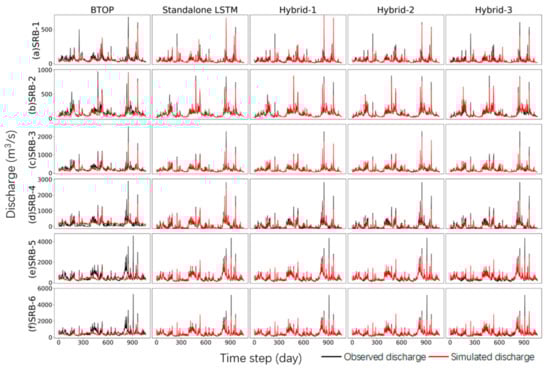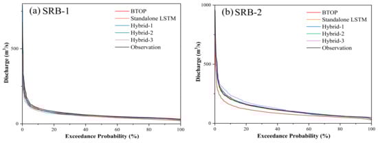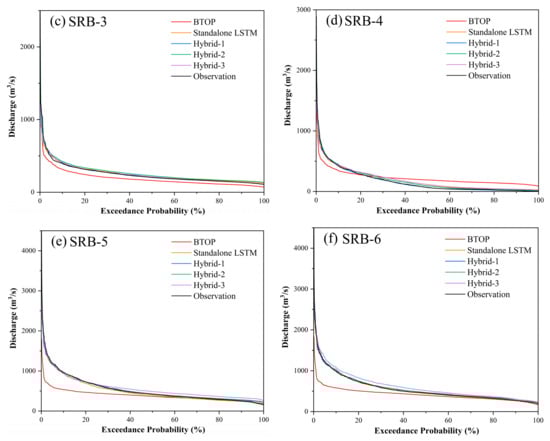 - Feeding the output variables from the BTOP model into LSTM as input features could provide LSTM with more physical information for learning, thereby improving simulation accuracy. Hybrid-1 and Hybrid-2 displayed comparable performances throughout the basin, both outperforming the standalone LSTM. Moreover, the exceedance probability shows that the fit of the flow duration curve of Hybrid-1 and Hybrid-2 was better than that of the standalone LSTM, and the main error of the two hybrid models originates from the slight underestimation of high flow.