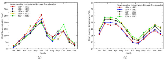 Figure 3a,b displays decadal mean monthly precipitation and temperature for the past 50 years. The bimodal precipitation pattern remains visible in the precipitation climatology (Figure 3a). The wet season has two halves, the first of which starts in March and peaks in June, and the second in September and peaks in October. However, analysis of the decadal variability in precipitation patterns reveals a decrease in the precipitation amount at the peak of the first wet season and an increase during the second wet period.