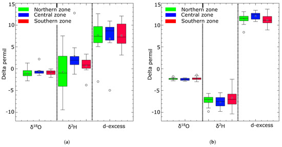Box-and-whisker plots of the variation in the and ratios and the calculated d-excess for the surface water (a) and groundwater (b) samples for the three zones.