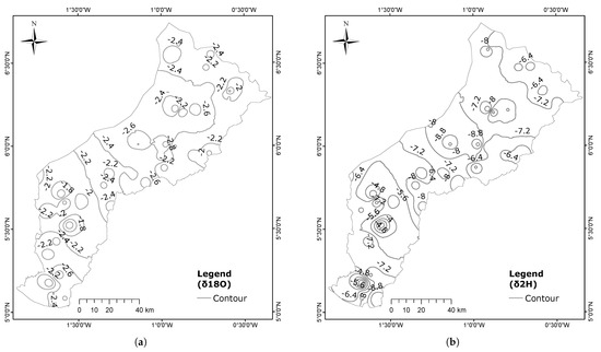 where Rsample and Rstd are the stable isotopic ratios of oxygen and deuterium of the water samples and the standard concentration, respectively. The chloride concentrations in groundwater and precipitation were taken from Manu et al. [1] and Duah et al. [14], respectively. Bivariate plots were used to construct surface water and groundwater regression lines using the vs. plot. The water samples’ isotopic composition was interpreted considering the local and the global meteoric water lines established by Akiti [37] and Craig [38], respectively.