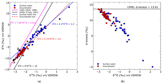 (a) Surface water and groundwater and relationship plots used to infer the origin and evaporation influence. Also featured are the local [37] and the global [38] meteoric water lines. Both water sources defined an evaporation line with lower slopes, indicating the change in the and isotope ratios in the initial precipitation. (b) The d-excess vs. plot provide information about the influence of evaporation. Almost all samples plot below the d-excess of the LMWL, indicating that the precipitation that recharged the surface water and groundwater experienced evaporation. The intercept of the surface water and groundwater lines (A and B) indicates precipitation’s initial isotopic signature before recharge.