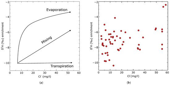 (a) Conceptual diagram showing the potential recharge pathway affecting changes in groundwater isotopic composition and concentration (modified after Love et al. [12]). (b) Deuterium vs. shows no clear dominant process influencing groundwater recharge.