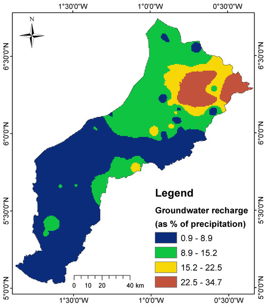 The basin-wide distribution of groundwater recharge shows high values in the northern parts, which are underlain by the Birimian meta-sedimentary rocks, while the lower recharge areas correspond to the granitoid. In a previous study [1], the northern parts of the study area were proposed as a recharge zone likely to receive direct recharge from precipitation. With direct recharge, lower values are expected than in waters with a high evaporation rate before reaching the aquifer. Among these two lithologies, the Birimian meta-sediments composed of phyllite have higher aquifer permeability than the granitoid [3,59]. Because secondary porosity governs the occurrence of groundwater in the terrain [59], it is likely that more vertical recharge is expected in the phyllite aquifers to the north than to the south, which is granitoid and less permeable compared to the Birimian rocks. The accuracy of the CMB estimates could be improved by using long-term data on chloride () instead of the one-time measurements used in this study. Unfortunately, long-term monitoring data on in the Pra Basin was not available during this research.