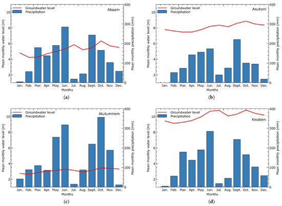 Groundwater hydrographs and observed averaged monthly precipitation at some selected locations (a) Abaam, (b) Asuboni, (c) Atutumirem and (d) Kwaben in the Pra Basin for the water year 2022.