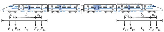 where Pni is the axle load for ith wheelsets of the nth carriage. As indicated in Figure 1, Ln is the length of the nth carriage, an is the length of the bogie wheelbase, and bn is the distance from the second to third axles of the carriage of the nth carriage. ; ; ; , among which x0 is the distance to the first axle load position.