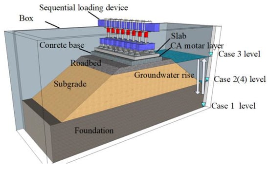 Natural factors, such as rainfall and fluctuations in groundwater levels, can cause changes in the water content of the foundation and embankment, leading to a variation in their mechanical properties, which in turn affects the critical velocity and dynamic response characteristics of the entire embankment–foundation system when subjected to high-speed train load [16]. Jiang et al. [17] investigated the impact of groundwater level rise on the dynamic performance of the embankment–foundation system based on a full-scale physical model of a ballastless track. Similarly, Chen et al. [18] studied the relationship between groundwater level rise and subgrade deformation based on a full-scale physical model. Chen et al. [19] investigated the dynamic response characteristics of the high-speed train subgrade under rainwater infiltration by conducting large-scale field tests.