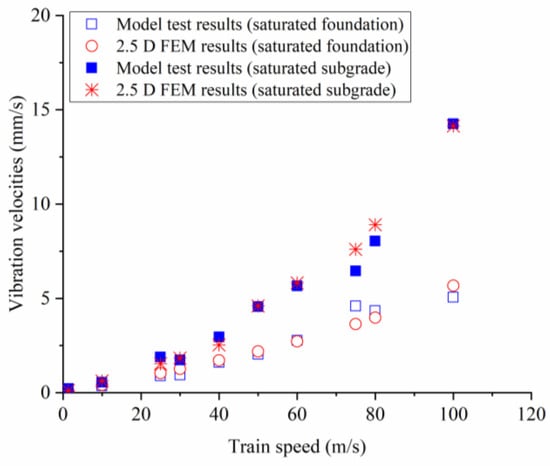Jiang et al. [17] constructed a full-scale model of a slab track–embankment system following the design specifications for Chinese high-speed trains. Figure 2 illustrates a standard high-speed railway line in China in a realistic setting. Figure 3 provides a schematic diagram of the full-scale model and the test cases conducted in Jiang’s study. In his test, the groundwater level in Case 1 is at the bottom of the foundation soil; with the water rise, the groundwater level for Case 2 is at the surface of the foundation and subgrade, respectively. In Case 4, the groundwater level returns to the surface of the foundation, enabling an exploration of the effects of the drying and watering cycle on the subgrade. In Jiang’s full-scale model test [17], the dynamic performances of this track–embankment system under several typical groundwater levels were measured. In this section, measurements of vibrations at the embankment surface in Cases 2 and 3 were selected to validate the simulation results. As shown in Figure 4, the vibration velocity of the embankment surface calculated by the 2.5D FEM is compared with the model test results. The comparison reveals that, in the range of train speeds from 1 m/s to 100 m/s, the 2.5D finite element calculation results match the test results, verifying the accuracy of the 2.5D finite element model.