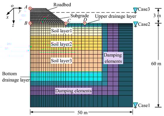 In this section, a 2.5D finite element model illustrating the track–embankment–foundation coupling system is depicted in Figure 5. The model possesses a total depth of 63 m and a width of 100 m. The embankment is 3 m thick, encompassing a 0.4 m roadbed and a 2.6 m subgrade. The foundation is structured with an upper permeable layer (0.5 m thick), followed by soil layers: soil layer 1 (3 m thick), soil layer 2 (3 m thick), soil layer 3 (12 m thick), and a lower permeable and damping layer (24.5 m thick), arranged in order from top to bottom. A 2.5D saturated linear elastic element with six degrees of freedom is utilized to simulate the embankment, soil layers, permeable layer, and damping layer. By selecting parameters α, M, n, and m to be close to 0, the saturated two-phase medium can be simplified into a single-phase medium to simulate the soil above the groundwater level. The model incorporates five observation points, designated as A to D. Point A is situated on the surface of the embankment, point B resides on the surface of the foundation, point C is positioned at the foot of the embankment, and point D is located on the ground, 10 m away from the center of the embankment.