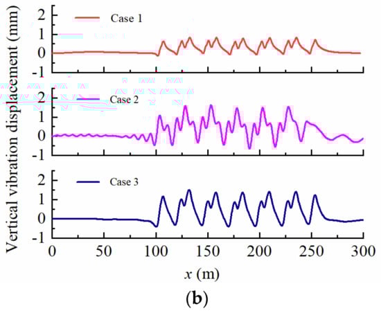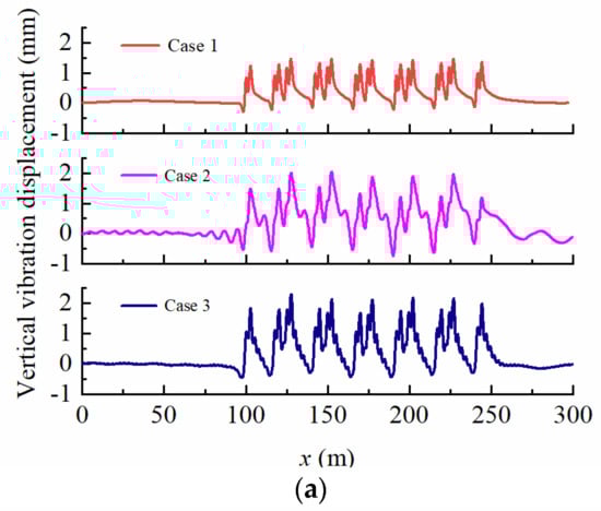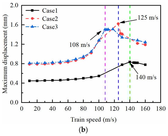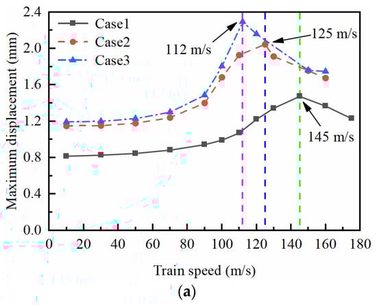 From Figure 7a, it can be observed that the displacement response amplitudes at point A follow a similar trend across all Cases, but the shape of the displacement response is influenced by the groundwater levels. When the groundwater level is at the bottom of the foundation (Case 1), the displacement response time–history curve displays a “peak column” at the train axle, with a maximum displacement response value of 1.48 mm. When the groundwater level is at the surface of the foundation (Case 2), the shape of the displacement response is similar to that of Case 1 but with a maximum displacement response value of 2.05 mm, representing a 38.5% increase compared to Case 1. When the groundwater level is at the surface of the subgrade (Case 3), the displacement time–history curve at the train axle not only displays a “peak column” but also exhibits fluctuation. The maximum displacement response value in Case 3 is 2.3 mm, representing a 55.4% increase compared to Case 1. These findings indicate that the increase in groundwater level within the embankment causes more violent vibrations. Based on Figure 7b, it is evident that the displacement response amplitude at point B follows a similar development trend as that at point A under the critical velocities of each Case. The groundwater level also has an impact on the foundation displacement response, with the maximum displacement response being 0.833 mm for Case 1 when the groundwater level is at the bottom of the foundation. For Case 2, the maximum displacement response is 1.62 mm, which represents a 94.5% increase compared to Case 1. Similarly, for Case 3, the maximum displacement response is 1.50 mm, which is an 80.1% increase compared to Case 1. Comparing Figure 7a,b, it can be inferred that the vibration displacement response at the surface of the embankment is more pronounced than that at the surface of the foundation when the same groundwater level is present.