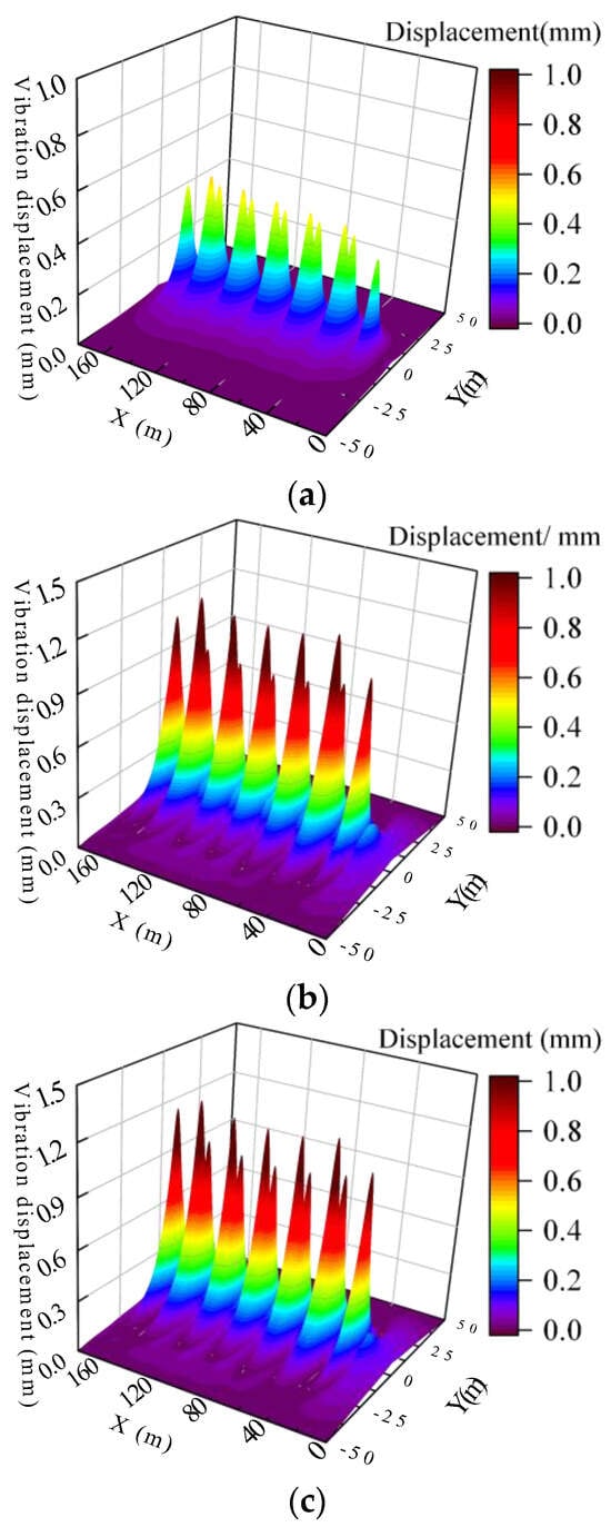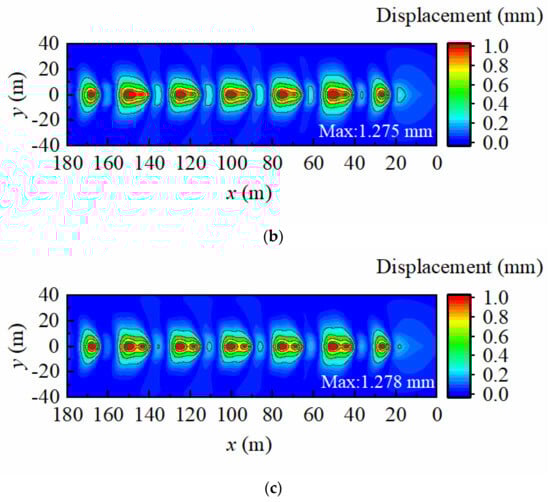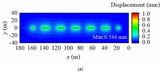 Figure 8 shows the three-dimensional distribution of the displacement responses at the foundation surface when the train is running at 100 m/s under different groundwater levels. Figure 9 shows the corresponding displacement responses at the x–y plane.
