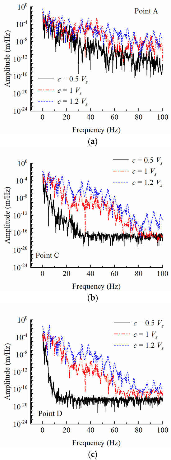 As shown in Figure 10, at point A, the frequency spectrum amplitudes for the three speeds are larger than other observation points. In the low-frequency region, the differences in the corresponding amplitudes under different velocities are not obvious. However, in the high-frequency region (>30 Hz), the amplitude increases with the velocity. Figure 10b,c illustrates that when the train runs at 0.5 Vs, the high-frequency response in the foundation attenuates rapidly, while the high-spectrum lines at the other two speeds remain in a higher position. This suggests that the high-frequency response at high speed attenuates slowly in the foundation, leading to a larger high-frequency response area and a slower attenuation rate in the surrounding foundation as the train speed increases.