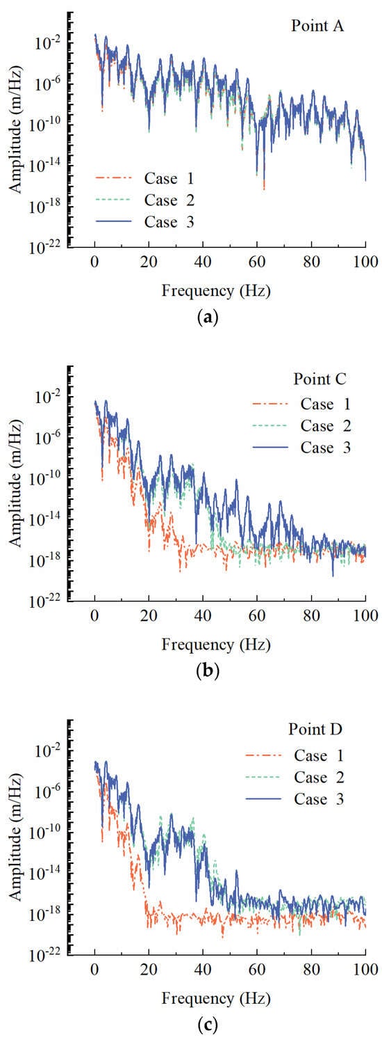 Figure 10 shows the frequency spectra curves of the displacement response at observation points A, C, and D under Case 3, with consideration to three train operating speed conditions: 0.5 Vs, 1 Vs, and 1.2 Vs. In this context, the value of Vs in Case 3 is 112 m/s.