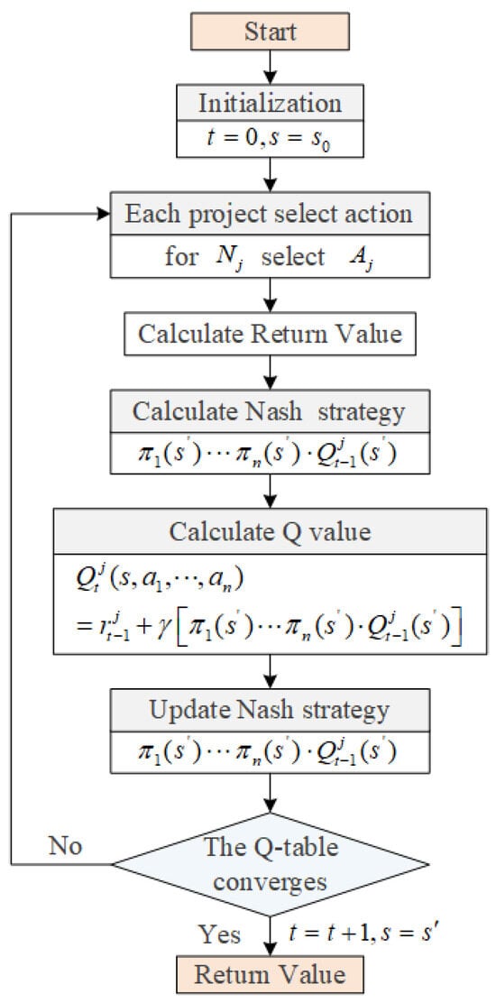 When multiple projects are involved, the system environment is more complex, so multi-agent reinforcement learning should be used for research. The Nash -learning algorithm is suitable for multi-agent algorithms, and its value update is based on the Nash equilibrium income of each agent. In this case, an agent needs to observe its own reward and that of other agents. The state transition and reward of the multi-agent are established under the condition of joint action. If the reinforcement learning process of the multi-agent is described by a random game, it can be expressed as a tuple . The letter refers to the number of participating agents, and refers to the joint system state achieved by multiple agents. The state transition function refers to the probability of transferring to the next state when given the current state and its joint behavior. The return function is denoted as , and its specific connotation is the return value obtained when the state of agent changes from to after taking the joint action . In this paper, is used to represent the function of any agent, where refers to the action of agent when the state is . is defined as the Nash function of agent . When all agents adopt the Nash equilibrium strategy, the Nash Q function is the sum of the current return of agent and its future return, which can be obtained as follows: