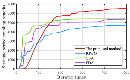 To further validate our method’s performance, we contrasted it with three leading algorithms: the Improved Grey Wolf Optimizer (IGWO), the Crow Search Algorithm (CSA), and the Flow Direction Algorithm (FDA). While these algorithms aim to achieve the same objective as our method, they cannot set a detailed strategy for each project during the optimization process. The results of the performance comparison are shown in Figure 3. By integrating the Nash Q-Learning algorithm, our method achieved a superior return value of 6504.727, outperforming the IGWO, CSA, and FDA by 38.141%, 20.319%, and 20.827%, respectively.