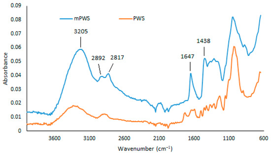 As shown in Figure 2, FTIR analysis of the mPWS reveals a broad vibration band at 3205 cm−1, which represents hydroxyl groups (-OH). The peaks at 2892 cm−1 and 2817 cm−1 can be assigned to the C-H stretching vibrations of the -CH2 and -CH3 groups, respectively. Aromatic cyclic groups could be assigned to the peak at 1647 cm−1, while the peak at 1438 cm−1 could be associated with quaternary ammonium groups, introduced into the native poplar sawdust during the modification procedure. Similar results are also reported elsewhere [26,27].