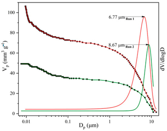 The importance of the first and second intrusion cycles lies in the removal of voids and interparticle space, which are characteristic of powdery materials. In the first intrusion cycle (run I), mercury fills that space, while in the second intrusion cycle (run II) it fills only the space of accessible pores [28]. The MIP results of the analysed samples indicate the more prominent difference in total intruded Hg volume and porosity (about 54%) between two consecutive runs, which could be ascribed to the presence of interparticle space. However, such a difference is not only a result of the presence of interparticle space, but also of the ink-bottle effect, which significantly affects the trustworthiness of pore size features. In the intrusion cycle, the pressure increase forces mercury to intrude through throat pores to reach interior ink-bottle pores, which cannot be freely extruded out in the extrusion cycle, leaving mercury to remain irreversibly entrapped in the interior ink-bottle pores, making it unavailable for the second intrusion cycle [29]. Generally, the porosity of the analysed sample is low; this is in accordance with the nature of the sample, wood scraps, which present a material made of tiny tracheae and tracheids that carry food through the plant. Also, the value of the specific surface area determined by mercury intrusion porosimetry is very low, which is in agreement both with the value of the total porosity and with the size of the pores that prevail in the analysed sample [30]. The PSD curves (Figure 3) indicate the macropore nature of the analysed sample, the maximum sizes of which are centred at diameters between 7 and 9 µm.