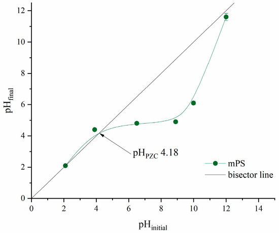The point of zero charge (PZC) of the adsorbent was determined according to a well-known procedure described in previous literature [18]. Twenty mL of 0.01 M solution of NaCl, previously set with pH values in the range from two to twelve, was added over 20 mg of mPS and shaken for 24 h at 25 °C. After that, the supernatant was separated, and the final pH (pHf) value was measured for each sample. The initial and final pH values were correlated, while the pH of PZC represents the intersection point between the curve pHf vs. pHi and the bisector line.