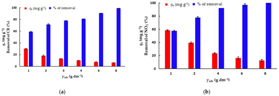 The effect of the biosorbent concentration on the removal of (a) CR (γCR = 50 mg·dm−3) and (b) nitrate ions (γNO3− = 100 mg·dm−3).