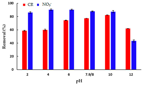 The effect of pH on the adsorption of: CR (γ = 50 mg·dm−3) and NO3− (γ = 100 mg·dm−3). All experiments were performed at 25 °C over 180 min, using an adsorbent concentration of 3 g·dm−3 (for CR) and 4 g dm −3 (for NO3− adsorption).