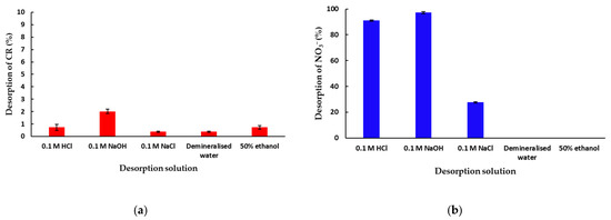 In order to investigate the potential of mPWS regeneration after the adsorption of CR and NO3− anions, a desorption study was performed. The effect of selected eluents (0.1 M HCl, 0.1 M NaOH, 0.1 M NaCl, demineralised water and 50% ethanol) on the percentage of the desorbed CR or NO3− ions is presented in Figure 7a,b, respectively.