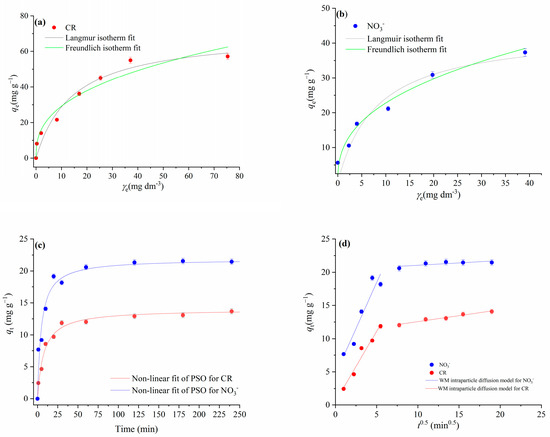 Results of experimental adsorption data modeling for CR and nitrate ions onto mPWS: (a) Langmuir and Freundlich isotherm models for CR adsorption (γ0CR = (25, 50, 75, 100, 150, 200, and 250) mg·dm−3, γmPWS = 3 g·dm−3, t =180 min); (b) Langmuir and Freundlich isotherm models for nitrate ions adsorption (γ0NO3− = (25–250) mg·dm−3, γmPWS = 4 g·dm−3, t = 180 min); (c) non-linear fit of pseudo-second-order kinetics for NO3− adsorption (γ0NO3− = 100 mg·dm−3, γmPWS = 4 g·dm−3) and CR adsorption (γ0CR = 50 mg·dm−3, γmPWS = 3 g·dm−3); (d) Weber and Morris intraparticle diffusion plot for the adsorption of NO3− (γ0NO3− = 100 mg·dm−3, γmPWS = 4 g·dm−3, t = 1–240 min) and CR (γ0CR = 50 mg·dm−3, γmPWS = 3 g·dm−3, t = 1–240 min).