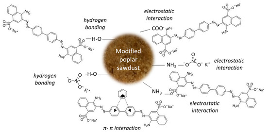 In this study, we have attempted to address these issues, and propose the use of chemically modified poplar sawdust, using epichlorohydrin, ethylenediamine, and triethylamine, for the effective removal of Congo red and nitrate from water. This research presents a detailed investigation into the synthesis, characterization, and adsorptive performance of modified poplar sawdust. We aim to underscore its potential as an economical and efficient biosorbent for water treatment, contributing to the broader understanding and advancement of using modified lignocellulosic waste materials in water pollution control. Our findings offer valuable insights into the practicalities of using chemically modified poplar sawdust for water treatment.
