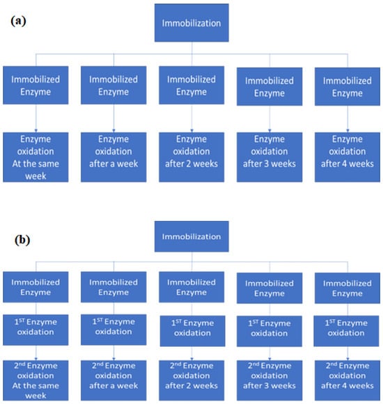 Schematic representation of the oxidation assays performed to evaluate the enzymatic activity after storage time under refrigeration (a) before its first use, and (b) after its first use and before its second use.