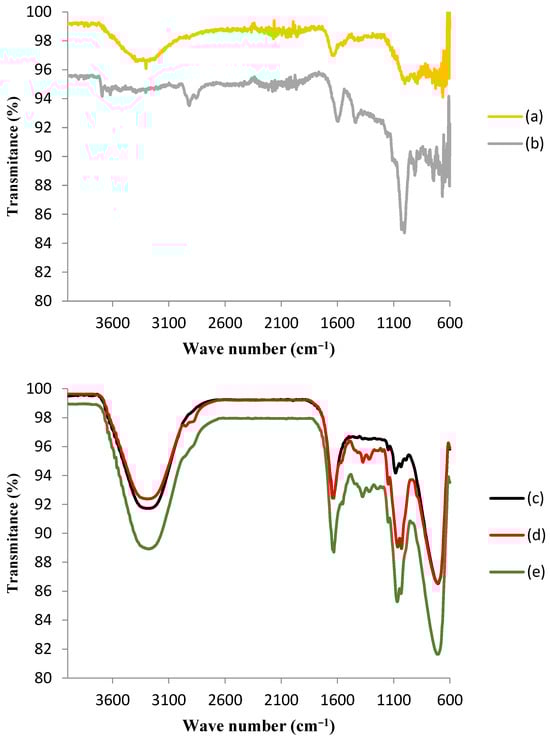 The lower portion of Figure 3 presents the comparison among the FTIR spectra of chitosan beads before activation (c), after activation (d), and after tyrosinase enzyme immobilization (e). The infrared spectrum of chitosan beads was characterized by the presence of a large band between 3400 and 3200 cm−1, which was attributed to the axial deformation of the O-H group associated with other polar groups through intra- and inter-molecular hydrogen bonds and to the axial deformation of N-H, normally obscured by hydrogen bonds with OH groups. The activation with GA may be confirmed by the appearance of a peak in the region around 2900 cm−1 and another one in the region near 1600 cm−1, as a result of the interaction of GA with chitosan functional groups. As it was observed for the GAC FTIR spectrum after immobilization (b), the presence of tyrosinase was suggested via the existence of the most pronounced peak in the region of 1100 cm−1, which is indicative of the presence of histidine. Immobilization was also responsible for the disappearance of the peak in the region around 2900 cm−1, indicating the interaction between tyrosinase and the modified chitosan surface [33].