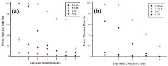 Figure 6a,b present phenol removal from aqueous solutions of 10 mg/L and 60 mg/L, respectively, via enzymatic oxidation with T-GAC, T-ACBs, and adsorption on GAC and ACBs, according to the number of reuse cycles of the support.