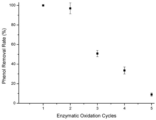 The decrease in removal efficiency, with the increase in the initial concentration of phenol, may be explained not only by the smaller proportion of immobilized enzyme available for oxidation but also by the fact that o-quinone, formed during the degradation of phenol through tyrosinase, inactivates this enzyme when in higher concentrations [41,42]. Another reason for solutions with high initial phenol concentrations not attending the limit established by CONAMA 430/2011 [13] is the short contact time, which was set at 120 min in order to avoid prolonged contact of o-quinone with the immobilized enzyme, thus avoiding its inactivation. Other authors needed 8 h (480 min) to remove practically 100% of phenol from solutions initially containing 100 mg/L, presenting a great loss in their material’s enzymatic activities in latter oxidation cycles [26,35].