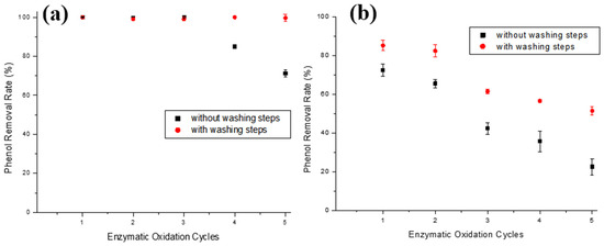 Phenol removal efficiencies during enzymatic oxidation cycles using T-ACBs of aqueous phenol solutions of (a) 10.0 mg/L and (b) 100.0 mg/L, without or with intermediate washing steps. Experimental conditions: initial activity of 1500 U, T-ACBs concentration of 20 g/L, stirring of 15.7 rad/s, 298 K, and contact time of 120 min.