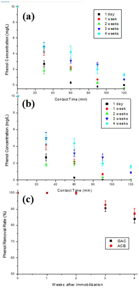 Enzymatic oxidation using immobilized tyrosinase one day after immobilization reached 100% of phenol removal within 60 min for both materials (Figure 9a,b), similarly to what was found by other authors, such as Chavita [35] and Pigatto [43]. Analyzing the graphs, it is shown that phenol removal decreases as the time between immobilization and enzymatic oxidation increases, and that, after the fourth week of storage, the activity drop was more accentuated in both cases. According to the results, the immobilized enzymes on both supports removed 100% of phenol from a 10 mg/L solution after 2 weeks of storage in refrigeration. After 3 and 4 weeks of storage, the enzyme showed an efficiency drop of 9.5% and 16.0%, respectively, when immobilized on GAC, and 7.3% and 12.6%, respectively, when immobilized on ACBs.
