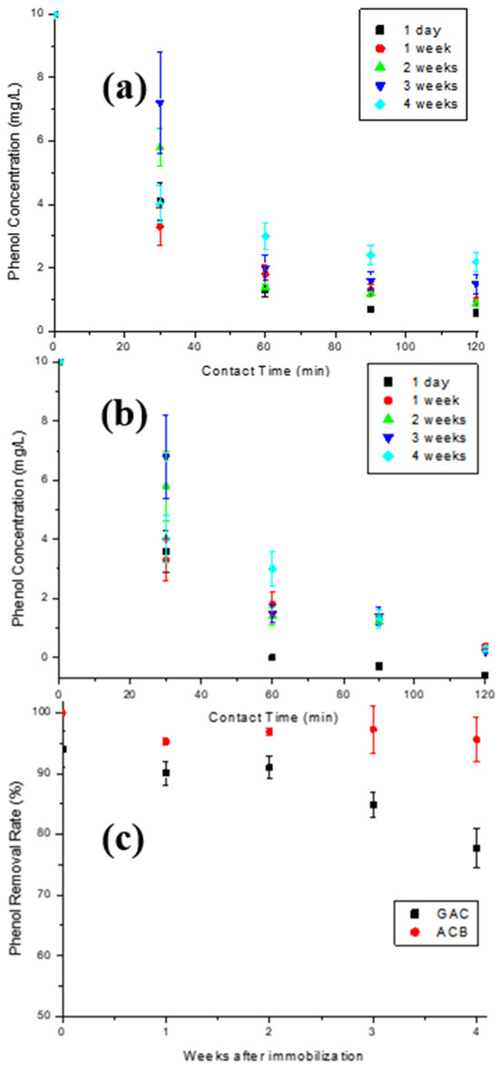 Enzymatic oxidation of phenol solutions containing 10 mg/L using (a) T-GAC and (b) T-ACB, and (c) phenol removal efficiency after enzyme oxidation concerning the time between immobilization and its first use with the T-GAC or T-ACBs. Experimental conditions: initial activity of 1500 U, constant stirring of 15.7 rad/s, and 298 K.