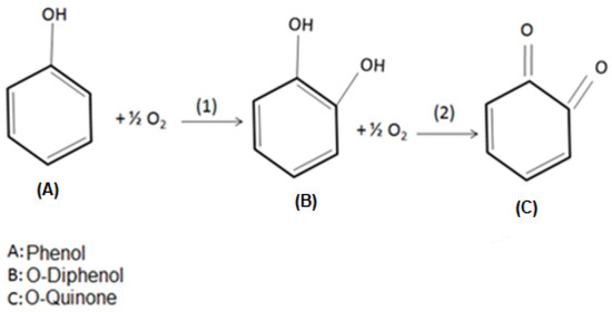 Tyrosinase may present three oxidation states (oxi, met, and deoxi), which are related to its active site. In the oxy state, the monofenolase activity takes place, while difenolase occurs under the met and deoxy states. Under monofelonase activity, the phenol molecules bind to Cu atoms in the enzyme’s active site, leading to its hydroxylation, producing o-diphenols. During difenolase, the oxidation of o-diphenols results in the formation of o-quinones [44,45,46]. Figure 11 illustrates such enzymatic oxidation reactions.