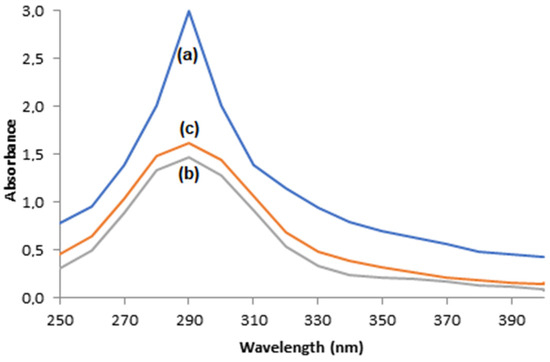 The photos displayed in Figure 12 show that the dark color is less intense when oxidation took place through immobilized enzymes when compared to the free enzymes, which is an indication the that supports, that are adsorbent materials, were able to adsorb the o-quinone produced. This indication is corroborated by the UV–visible electron spectrophotometer scanning of solutions after enzymatic oxidation with free enzymes or immobilized ones, illustrated in Figure 13, where the absorbance peaks at 290 nm are smaller for oxidations with immobilized enzymes, suggesting the adsorption of o-quinone via the supports.