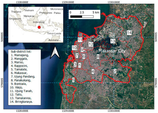 Makassar, also known as Ujung Pandang, is the capital and largest city of South Sulawesi province in Indonesia; the city is known as the industrial harbor of east Indonesia. It is located on the southwestern coast of the island of Sulawesi, which is one of the largest islands in Indonesia, as shown in Figure 1. It is situated on the western side of the South Sulawesi peninsula. Makassar is primarily a coastal city, and its topography is characterized by low-lying coastal plains. The city is situated along the Makassar Strait, which separates Sulawesi from Borneo. The coastal areas are relatively flat and feature beaches. The city is traversed by several small rivers and streams that flow into the Makassar Strait [4]. These rivers have influenced the city’s development and provided freshwater resources.