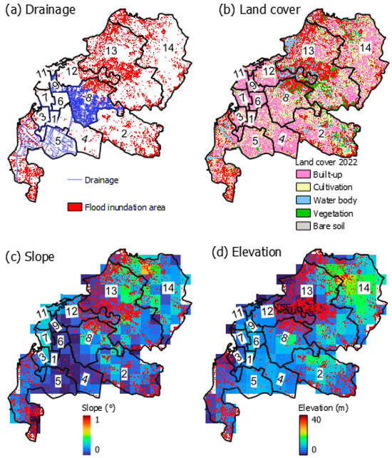 Comparison between flood inundation map and physical factors of flood. (a) Drainage, (b) land use/land cover, (LULC), (c) slope, (d) elevation.