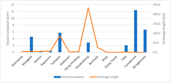 Flood inundation (km2) and drainage length (km) per sub-district.