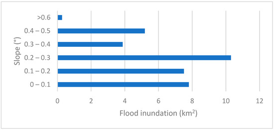 The extent of the flood inundation in a given area is significantly influenced by the terrain’s slope and elevation, as illustrated in Figure 5. Notably, this study examined slopes ranging from 0° to 0.3°. A substantial increase in the inundation area becomes evident when compared to steeper gradients exceeding 0.3°. This phenomenon can be attributed to the fact that the 0.2° to 0.3° slope range boasts the highest inundation levels in this study. This is primarily due to the extensive land cultivation practices occurring within this gradient range.