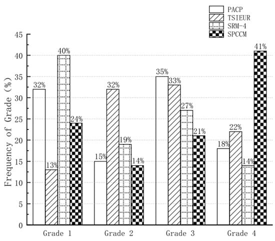 As shown in Figure 1, most pipes are assigned as Grade 2 (32%) and Grade 3 (33%) as per TSIEUR. However, most pipes are assigned as Grade 1 (32% for PACP and 40% for SRM-4) and Grade 3 (35% for PACP and 27% for SRM-4) by PACP and SRM-4. SPCCM gives the most different evaluation results, with 41% of pipes being Grade 4. In this experiment, the evaluation results obtained from SRM-4 are the most optimistic, with 59% of pipes being Grade 1 and Grade 2, while SPCCM gives the most pessimistic results, with 62% of pipes being Grade 3 and Grade 4. PACP and TSIEUR are in the middle. SRM-4 results show that 40% of the pipes are in good condition and belong to Grade 1, while SPCCM results suggest that 41% are Grade 4 pipes that need rapid repair. These assessment results are different from the results of Khazraeializadeh et al. [], who found that the assessment results from PACP were most optimistic and the results from SRM-4 and SPCCM were similar. The reasons for the significant differences in the evaluation results of the four protocols are further analyzed and discussed.