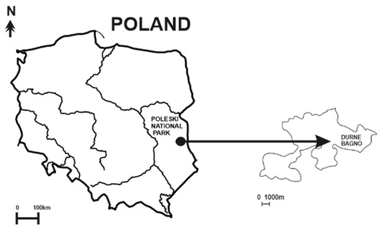 Restoration procedures involving cutting down birch trees (Betula L.), which have colonized the central part of wetland areas and the lagg zone in massive numbers, were carried out in the Durne Bagno peat bog (Polesie National Park, 51° N, 23° E) (Figure 1). In the 1960s and 1970s, intensive drainage procedures were carried out in the Polesie Lubelskie region, lowering the groundwater and surface water level and leading to the drainage and degradation of peatlands. This resulted in the intensification of succession processes and overgrowth—mainly by common reed or birch. In the 1990s, restoration measures were initiated to improve the hydrological conditions in Polesie National Park and inhibit the overgrowth of the peatlands. Active conservation measures in the Durne Bagno peat bog have been carried out since 2006, primarily involving the removal of trees or shrubs (including birch growing on parts of the bog). The sites where birch trees were removed constituted study samples, while sites where birch trees were not removed constituted control samples. At the sites where birch trees were removed, the dominant taxa are currently Eriophorum vaginatum (L.), Carex acutiformis Ehrhart., Carex gracilis Curt., Sphagnum angustifolium (C.C.O. Jensen ex Russow), Sphagnum cuspidatum Ehrh. Ex Hoffm. and Polytrichum sp.